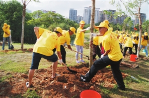 在植樹現(xiàn)場,市總工會機關干部職工、文化宮、海員俱樂部、椰樹、椰島、市城投、市人民醫(yī)院、海旅控股、華聞傳媒、威立雅等企業(yè)負責人及職工共500多人,頭戴“海口工會‘雙創(chuàng)’公益日行動”宣傳小黃帽和T恤衫,揮汗勞動,種下了300多棵鳳凰樹。
