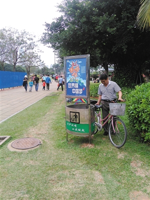 記者在白沙門(mén)公園也發(fā)現(xiàn)類(lèi)似“回收+宣傳”二合一造型的垃圾桶,桶上還多了煙頭和廢舊電池回收口,“踐行社會(huì)主義核心價(jià)值觀,做新時(shí)期美德少年”、“中國(guó)公民國(guó)內(nèi)旅游行為公約”等標(biāo)語(yǔ)紛紛借垃圾桶亮相。