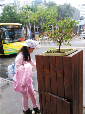 在國(guó)貿(mào)路上,記者看到桶頂戴“花冠”,配有木制“護(hù)身符”的垃圾桶。
