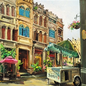 張建舉說,“每次單獨作畫,都好像在與騎樓對話。”于是,色彩豐富、主觀變現力強、明暗對比強烈、畫面視覺沖擊力大……這些繪畫風格在張建舉的??隍T樓筆下表現得異常強烈。一幅五彩斑斕的騎樓畫作中,樓上住戶、樓下商戶,及柱廊式的建筑下一把偌大搶眼的傘、小販車,無不將南洋風情表現得活色生香,畫面清晰動人。