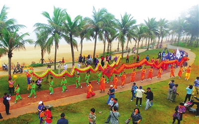 3月10日,今天是我國農(nóng)歷二月初二。民間有二月二龍?zhí)ь^祭海舞龍祈福來年風(fēng)調(diào)雨順的習(xí)俗。圖為海口假日海灘管理公司在西海岸帶狀公園及海灘等地舉行“熱愛海洋,保護(hù)環(huán)境”為主題的舞龍巡游活動(dòng)。本報(bào)記者 古月 攝