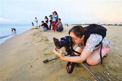 6月4日傍晚,??诎咨抽T海邊聚集了眾多攝影師、發(fā)燒友,他們架起長(zhǎng)槍短炮像狙擊手一樣站著、趴著、跪著,在沙灘上拍攝夕陽(yáng)美景。入夏以來(lái),??谔鞖庾兓媚獪y(cè),火燒云、彩虹、落日等氣象景觀輪番上演,給攝影愛好者提供了絕佳的拍攝時(shí)機(jī)。 南國(guó)都市報(bào)記者 陳衛(wèi)東 攝