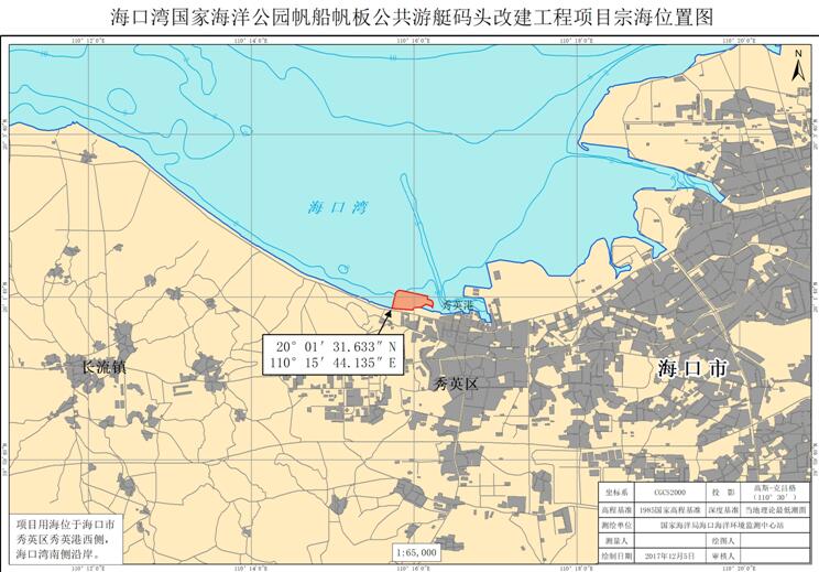 ??跒硣液Q蠊珗@帆船帆板公共游艇碼頭改建工程位于??谑行阌^(qū)秀英港西側(cè),??跒衬蟼?cè)沿岸,擬申請用海26.5335hm2,占用岸線637.5m,用海方式為透水構(gòu)筑物。計劃工期為15個月,項目宗海位置、宗海界址圖見圖1、圖2。